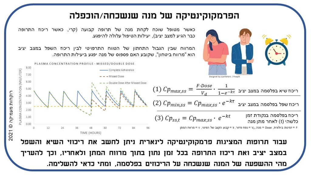 כאן ניתן לראות בבירור שנטילת מנה כפולה מקפיצה את הריכוזים בפלסמה מעבר לרמה המקסימלית שהמטופל מאוזן עליה (מכיוון שלתרופה פרמקוקינטיקה לינארית, הכפלה של המנה תביא להכפלת התרומה של המנה לריכוז התרופה בדם), ובמצב כזה הסיכוי לתופעות לוואי גבוה יותר (כמובן שאם החלון התרפויטי מספיק רחב, סביר שלא תהיה השפעה חריפה לקפיצה במינון, אולם עדיין מדובר בפרקטיקה שעלולה להוציא את המטופל מאיזון ומההרגלים שלו, ועלולות להיות לכך השלכות בהמשך).