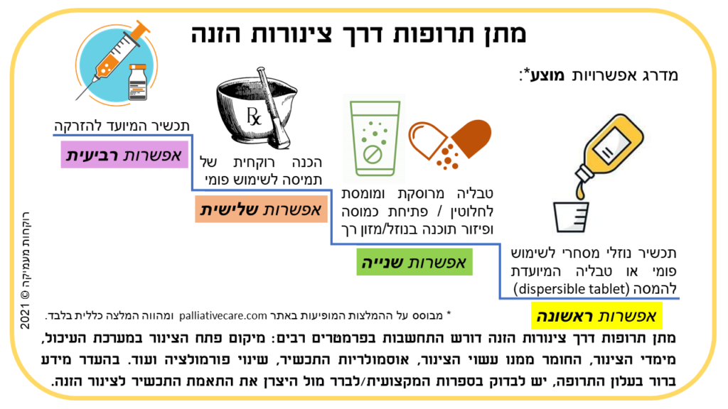 המלצה: יש לבדוק האם צינור ההזנה מגיע עד הג’ג’ונום או לא, ואם כן, לוודא האם התרופה שרוצים לתת אכן יכולה להיספג בג’ג’ונום והאם היא תרופה בעלת טווח תרפויטי צר.